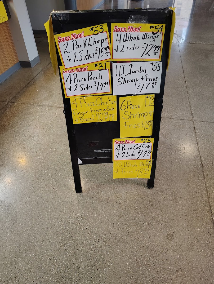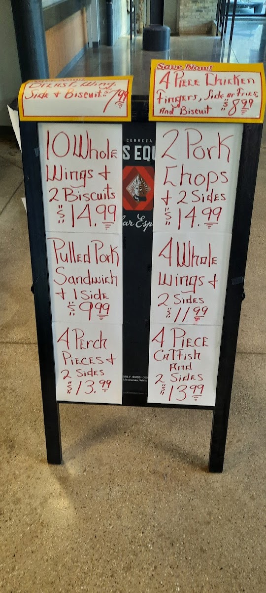 2 pieces of perch, 2 chicken wings, and 2 sides, typically includes fries and coleslaw.